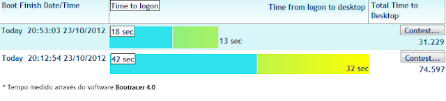 - Ao executar o primeiro teste com o Bootracer, obtemos um total de 74 segundos, sendo 42 segundos de boot e 32 segundos para a preparação do Desktop (tela de bem-vindo e inicialização de programas), resumindo 74 segundos para o computador estar pronto para uso.